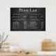 Cette grande affiche murale de liste de prix de designer graphique typographique contemporain est faite pour ressembler à un tableau noir, mais ne l'est pas. Il s'agit d'un modèle technologiquement avancé qui est configuré et prêt à être surtypé avec tous vos propres services et prix de salon de café.