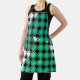 Ce tablier a un design moderne du milieu du siècle de diamants noirs solides à l'intérieur des contours de diamants noirs avec des triangles dans les nuances de vert de mer sous eux, le tout sur un champ de blanc.