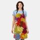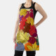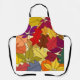 Ce tablier a une conception d'un tas de feuilles en vert, jaune, orange, bleu, marron et rouge sur un champ de jaune pâle.