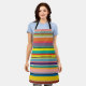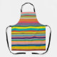 Ce tablier a un design de rayures horizontales dans les tons bleu, vert, marron, violet, rouge, jaune, orange et rose.