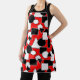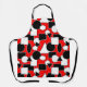 Ce tablier a une conception Bauhaus de triangles, cercles, rectangles et pentagons en noir et blanc sur un champ de rouge.