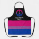 Medium-sized apron with an image of a bisexuality pride flag and a peace symbol; pink or magenta, purple and blue design on a black background, with a customizable text template for your own name or message