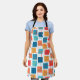 Ce tablier a un design géométrique de carrés en corail, orange, jaune et blues éparpillés dans leurs contours.
