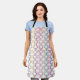 Ce tablier est décoré dans un style art déco avec des demi-cercles orange, turquoise, rose, bleu, violet et jaune reliés à des lignes sur un champ de blanc.