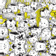 Illustration de doodle avec une collection dense de chats de dessin animé, en noir et blanc aux accents jaunes. Les chats sont dessinés dans un style simple et fantaisiste, avec des expressions et des poses variées, des gobelets ou des accessoires comme des lunettes. La composition est très serrée, créant une scène très animée et ludique. Le style évoque des croquis dessinés à la main, avec des contours audacieux et un minimum d'ombrage, rehaussés par l'utilisation sélective du jaune pour mettre en évidence certains éléments.