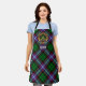 Clan Russell crest badge surrounded by a strap and buckle over tartan background. Custom text.