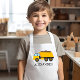 This kids' apron features an illustration of a yellow dump truck. Personalize it with your child's name in black letters.
