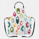 Ce tablier a un design moderne du milieu du siècle de lignes horizontales de couleur sur une ligne verticale noire avec des cercles.