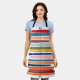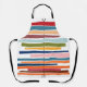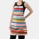 Ce tablier a un design moderne du milieu du siècle de lignes horizontales de couleur sur une ligne verticale noire avec des cercles.