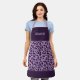 Tablier féminin tendance avec un motif design imprimé tache léopard violet ; personnalisable en ajoutant votre nom en lettrage lavande sur la bande violet foncé de la partie supérieure