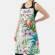 Beau tablier d'accent tropical avec éléments tropicaux en aquarelle : oiseau flamand, orchidées, fleurs d'hibiscus et feuilles de palmiers, fait un grand cadeau pour elle.