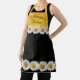 Un joli tablier fleuri en jaune moutarde et noir, décoré de rangées de marguerites blanches à la taille et à proximité de l'ourlet, et de fines rayures. Le texte dit "(nom personnalisé)'s Kitchen". Personnalisez en modifiant le nom.