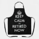 Drôle Gardez calme je suis à la retraite maintenant tablier barbecue de cuisine pour les hommes ou les femmes. Amusante idée cadeau pour la fête de la retraite. Personnalisé Restez calme et continuez le texte. Humour lié au travail pour le patron, collègue, employés, collègue, mari, femme, etc. Cuisine noire et tabliers de cuisson avec sangle colorée. Typographie audacieuse et design de couronne.