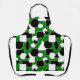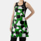 Ce tablier a une conception Bauhaus de triangles, cercles, rectangles et pentagons en noir et blanc sur un champ de vert.