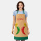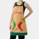 Ce tablier impressionnant comprend une paire de piments, un piment rouge et un piment vert. Ils ont tous deux les yeux noirs et la bouche rose. Chaque chili porte un casquette sombrero qui a un crâne de la couleur opposée au chili sur elle pour célébrer la fête mexicaine de la mort, Dia De Los Muertos. Le sombrero contient également trois fleurs avec alternance des pétales rouges et verts représentant le drapeau du Mexique. Il y a du texte personnalisé pour que vous puissiez inclure un nom.