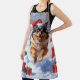 Un Keeshond moelleux parcourt joyeusement le paysage enneigé, portant un casquette de Noël rouge festif. La scène hivernale met en valeur l’épais manteau de la race, son visage expressif et sa personnalité joyeuse tout en célébrant la chaleur et l’esprit de la saison des fêtes. Un design chaleureux plein de charme festif.