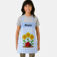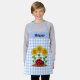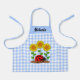 Cet tablier présente une coccinelle rouge souriante devant un groupe de tournesols jaunes et oranges. Ci-dessus est un nom de monogramme pour vous de personnaliser. L'Arrière - plan est bleu et blanc en vichy. Un grand tablier pour les enfants !