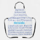 Les principaux monuments, parcs et îles d'Helsinki, la capitale de la Finlande, et destination de vacances bien gardée secret. Typographie en bleu et foncé ainsi que le bleu et le blanc du drapeau finlandais. Un tablier pour inspirer les recettes nordiques !