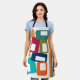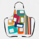 Ce tablier présente un design moderne du milieu du siècle de lignes et de rectangles dans les tons rétro orange, or, canneberge, turquoise, vert, bleu, turquoise et vert.