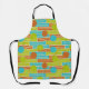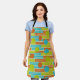 Ce tablier a un design moderne du milieu du siècle de rectangles répétitifs en vert citron, marron cannelle et turquoise avec des cercles superposés.