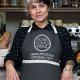 Tablier minimaliste de société noire, décoré de rayures blanches et facilement personnalisable avec votre propre logo, nom/position, et texte personnalisé en option ; parfait pour de nombreuses catégories d'affaires, comme les coiffeurs, esthéticiennes, spas, fleuristes, et bien plus encore.