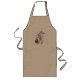 The picture shows a tan or beige full-length apron with two front pockets. Centered on the chest area is a small, whimsical Halloween graphic featuring a dancing skeleton wearing a party hat and carrying a jack-o'-lantern bucket, with confetti surrounding it.