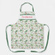 Festive appart de Noël a un motif de botaniques d'hiver, saints et baies, pépins de pin, minuscules fleurs blanches, roses rouges et étoiles découpées en carton rustique. Vous personnalisez avec votre nom en texte rouge en haut à l'intérieur d'un panneau bordé de bandes vertes qui correspondent au vert des cordes de tablier.