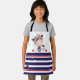 Illustration d'une fille qui se fait des amis avec un coccinelle à rayures bleu marine et blanc en dessous. Fait un adorable tablier de jardinage pour une fille.