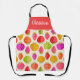 Il s'agit d'un tablier personnalisé avec des pommes colorées et des fraises uniques du milieu du siècle motif avec des étoiles atomiques rétro dans des couleurs vibrantes comme le rouge, jaune, violet, rose et vert.
