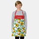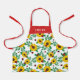 Apron floral avec un motif de coccinelles et de tournesols. Ajoutez le nom de votre enfant en lettres blanches sur un champ rouge.