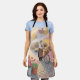 Une charmante rue européenne baigne dans la chaude lumière dorée de l'heure dorée sur un chemin de pavés. Une femme en tablier marron arrange un bouquet vibrant à côté de son vélo avec un panier plein de fleurs, entourée de présentoirs débordants de roses roses, de tulipes, de pivoines et de fleurs colorées sous des auvents rayés rose et blanc. Cette illustration joyeuse et nostalgique irradie de chaleur, de fraîcheur et de vibrations joyeuses du printemps.