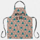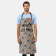 Ce tablier a une conception géométrique de triangles brun et tan extensibles avec des cercles turquoise sur un champ de blanc cassé.