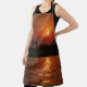 This apron features a vivid tropical sunset scene with glowing orange and red hues across the sky. Silhouetted palm trees and distant mountains frame the horizon, while the sun casts a shimmering reflection on the water below. The design blends practicality with artistry, bringing warmth and serenity to your kitchen. Perfect for cooking, baking, or crafting, it adds a touch of paradise to everyday tasks. A thoughtful gift for nature lovers, travelers, or anyone who enjoys vibrant landscapes and stylish kitchenwear.