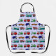 Ce tablier a un design novateur de camions et de bus en rouge, bleu, vert et marron sur un champ de bleu clair.