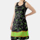 Ce design de vacances présente une toile d'araignée grise, avec un motif d'yeux verts au centre. Au bas de la conception il y a une bande verte avec le texte orange dit, "HAPPY HALLOWEEN".
