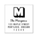 Tampon encreur auto-encreur moderne avec adresse au dos, doté d'une police carrée pour votre monogramme, d'une écriture élégante pour votre nom et d'une police grasse pour l'adresse. Vous n'aurez plus jamais à écrire votre adresse lorsque vous envoyez des lettres.