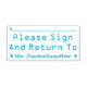 Cette estampille de base comporte le message "Veuillez signer et retourner à", ainsi qu'une ligne sur laquelle une signature ou des initiales peuvent être écrites ci-dessus. Il porte également le nom d’un enseignant ou d’un éducateur sur mesure. Un enseignant, un éducateur ou un tuteur pourrait peut-être l’utiliser pour demander à ses parents ou tuteurs d’examiner le travail de l’étudiant à l’occasion d’un examen, d’un papier ou d’une autre tâche.
