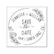 Ce timbre est un excellent accessoire pour tout couple qui cherche un cachet de date pour tous les envois liés au mariage. Cette conception comporte "enregistrer la date" au centre du design dans un mélange de polices à lettres avec vos noms, date mariage et emplacement mariage dans un cercle autour. Autour de l'extérieur du timbre se trouve un cadre circulaire avec 2 branches dessinées à la main donnant à ce timbre une atmosphère botanique et rustique.