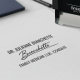 The custom signature stamp provides a professional and efficient solution for healthcare providers to authenticate administrative records and office documentation with a single impression. This design features the name of the practitioner in a bold, modern typeface positioned directly above the signature. Below the signature, a dedicated line for credentials and a license number ensures that every mark made is clear, traceable and authoritative while maintaining spatial efficiency through professional abbreviations.