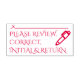 Cette élégante conception d'estampille en caoutchouc comporte le message "VEUILLEZ RÉVISER, CORRECTER, INITIAL & RETOURN", ainsi qu'une ligne où une signature ou des initiales pourraient être écrites ci-dessus. Il peut être utilisé par un enseignant ou un professionnel de l'administration pour demander que quelqu'un examine et reconnaisse le contenu d'un document ou d'autres documents.