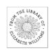 De la bibliothèque de ou ce livre appartient à un tampon en caoutchouc avec un dessin de marguerite au centre et votre texte personnalisé et votre nom dans une police serif fantaisiste.