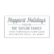 Caractéristiques de l'estampille auto-encastrée de l'adresse de vacances Happiest Holidays (peut être customisé) en écriture de script classique avec texte d'adresse de retour personnalisé. La couleur d'encre grise peut être customisée pour coordonner avec votre envoi de vacances.