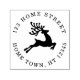 Un timbre circulaire personnalisé avec un renne bondissant encerclé par vos coordonnées. Idéal pour ajouter une touche estampillée à la main à vos cartes de fin de année.