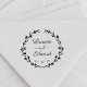 Timbre pour mariage sur mesure avec calligraphie à la main moderne avec couronne florale dessinée à la main. Personnalisez avec les noms des mariés et des mariés et la date du mariage. Parfait pour les mariages à thème rustique, champêtre et boho.