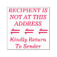Cette estampille en caoutchouc comporte les messages "Kindly Return To Sender" et "RECIPIENT IS NOT AT this ADDRESS", ainsi qu'une forme de flèche. Il peut être utilisé pour indiquer que le courrier reçu a été livré à la mauvaise adresse ou que le destinataire est inconnu, et doit être retourné à l'expéditeur.