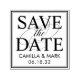 Un cadre carré clair entoure votre enregistrement des détails de la date (noms et date du mariage) avec "save the date" dans un élégant mélange de caractères de script de bloc et de calligraphie.