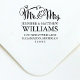 Le design d'adresse de retour rustique chic mariage comporte des caractères gras et amusants manuscrits M et Mme calligraphie typographie de script et accents de conception de défilement. Personnalisez l'élégant monogramme personnalisé avec votre nom de famille marié et le texte de l'adresse de retour pour votre jour de mariage décontracté.