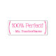 Ce design de timbres en caoutchouc encourageant comporte le message encourageant "Parfait à 100% !" et le nom d'un enseignant ou d'un éducateur sur mesure. Il pourrait être utilisé par un enseignant, un éducateur ou un tuteur pour marquer les affectations, pour indiquer que l'étudiant a fait un excellent travail.