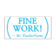 Cette conception amusante de timbres en caoutchouc comprend le message de rétroaction encourageant "FINE WORK!" et le nom d'un éducateur customisé. Il pourrait être utilisé par un enseignant, un éducateur, un instructeur ou un tuteur pour marquer les affectations, pour reconnaître que l'étudiant a fait un excellent travail.