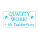 Ce design de timbres en caoutchouc encourageant comporte le message motivant "QUALITY WORK !" et le nom d'un enseignant, d'un éducateur ou d'un tuteur sur mesure. Il présente également des contours décoratifs en étoile. Il pourrait être utilisé par un enseignant, un éducateur ou un tuteur pour marquer les affectations, pour indiquer que l'étudiant a fait un excellent travail.